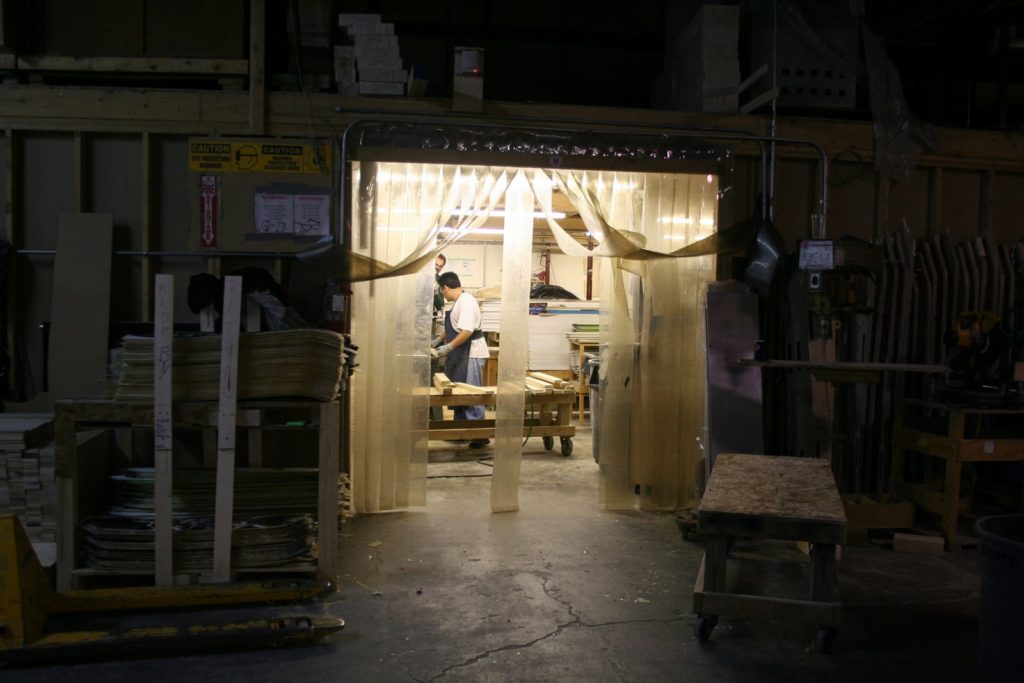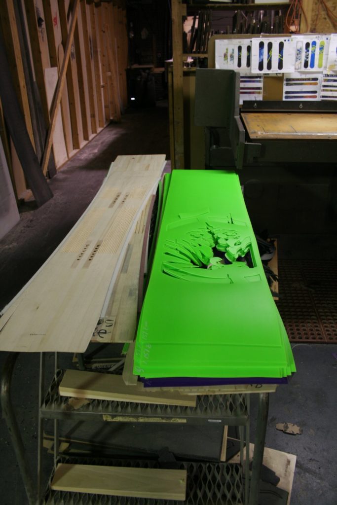 Inside the wood shop where Never Summer mills their own cores for each snowboard and longboard. With summer approaching, the longboard production is being finished up.