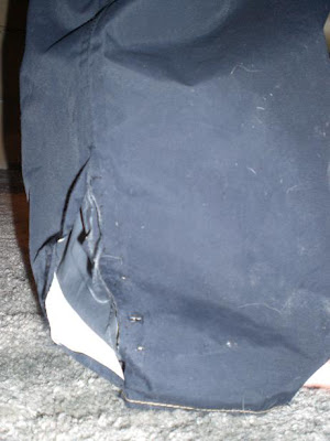 So I had to retire them. I took some pictures of how they look now. The first thing to go was the bottom seam around the base, once that went…then the side seam broke on the pants and basically looked like hippie flared pants now.
