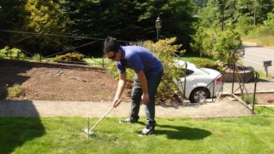 So we rolled out to the backyard, where the most ridiculous croquet course was laid out. Normally, croquet fields are set-up in a fairly standard/regulation lay-out. Not this course, among the objects to navigate were a underused fire-pit/flower garden, we couldn’t tell what the hell it was, an up-hill shot, tons of down-hill shots ultimately leading you to the front yard to the other post.