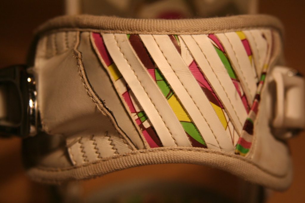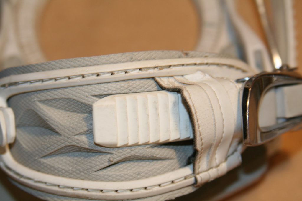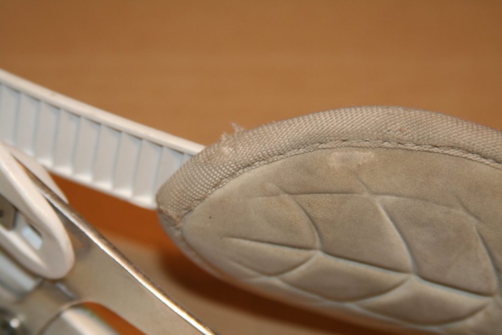 A glimpse at the inside of the ankle strap shows the ride time put in. It’s a little grimy in the color from the dirt and use. Small tear in one spot.