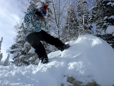 So I’ve been on a mission this year to do some new things. One of them is stalling on stuff and the second thing is bonking things. Today I did both, Andrew got this photo of me riding up onto the rock and trying to stall out. I did ride up and back down (yay) and later I saw a snow boundary pole and bonked it with the tail of my board (yay). Even at noon…found some powder without having to duck a rope or go into the trees. So I love Steamboat trees and will ride them once the season is underway, but this early in the season the chance of catching yourself on a barely covered tree is likely. So I’ll stay on the decent stuff, barely going into the trees until the coverage is a bit more.