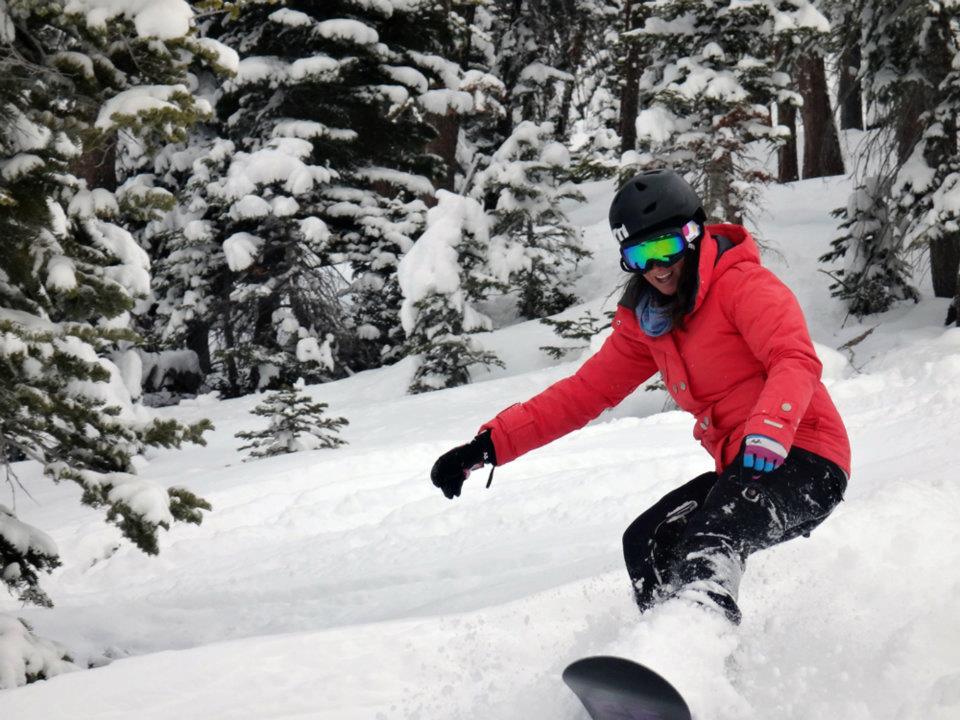 The moment I knew it was going to be a good day is when I was riding to the chairlift with this much snow collecting on my board. The snow report was saying 6 inches but it definitely felt like more out on the mountain and the snow kept coming down. Thankfully Lauren was our tour guide for the day and immediately brought us to West Bowl for powder turns.