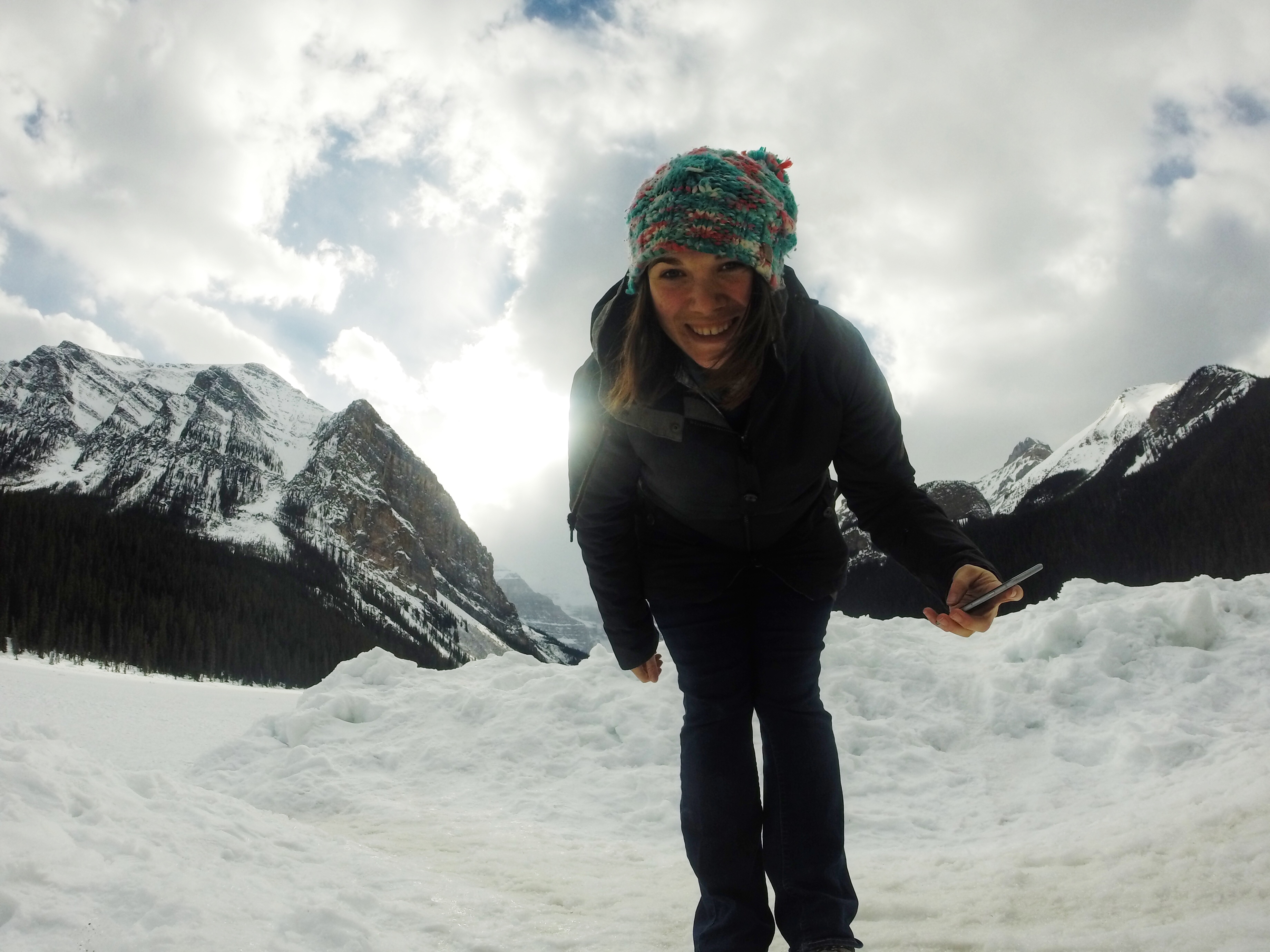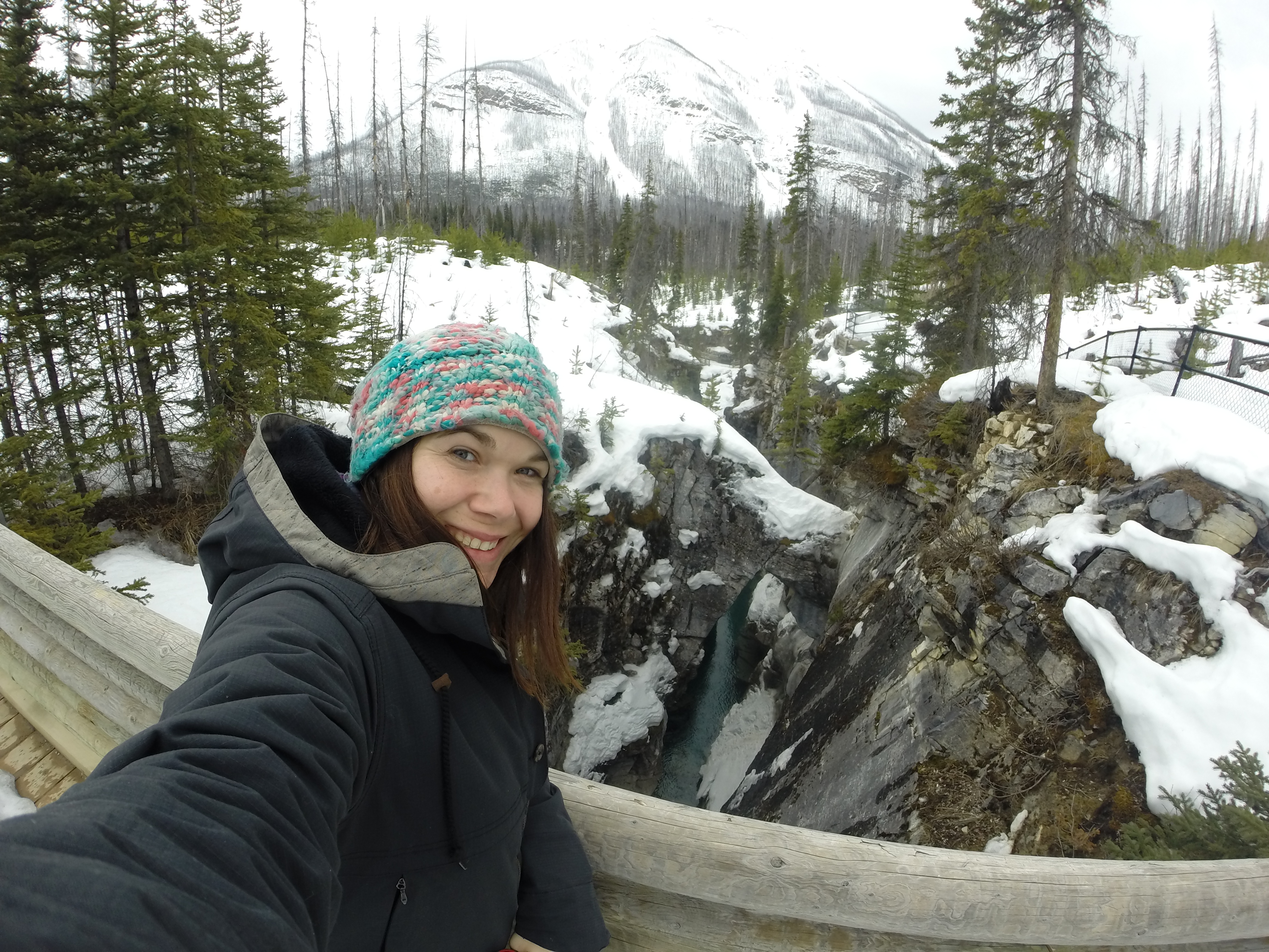It’s always fun to capture a journey when you are your own photographer. I captured this shot at Lake Louise with my GoPro and the mobile app to snap the photo (see the iphone in my left hand). This trip has been 90% about snowboarding but the other 10% is getting off the highways and seeing the surroundings along the way. On the drive from Lake Louise I drove through Kootenay National Park and ended up stopping at a couple highway attractions. The Marble Canyon was a really fun hike in the snow, over the bridges and just a rad natural environment to see in person.