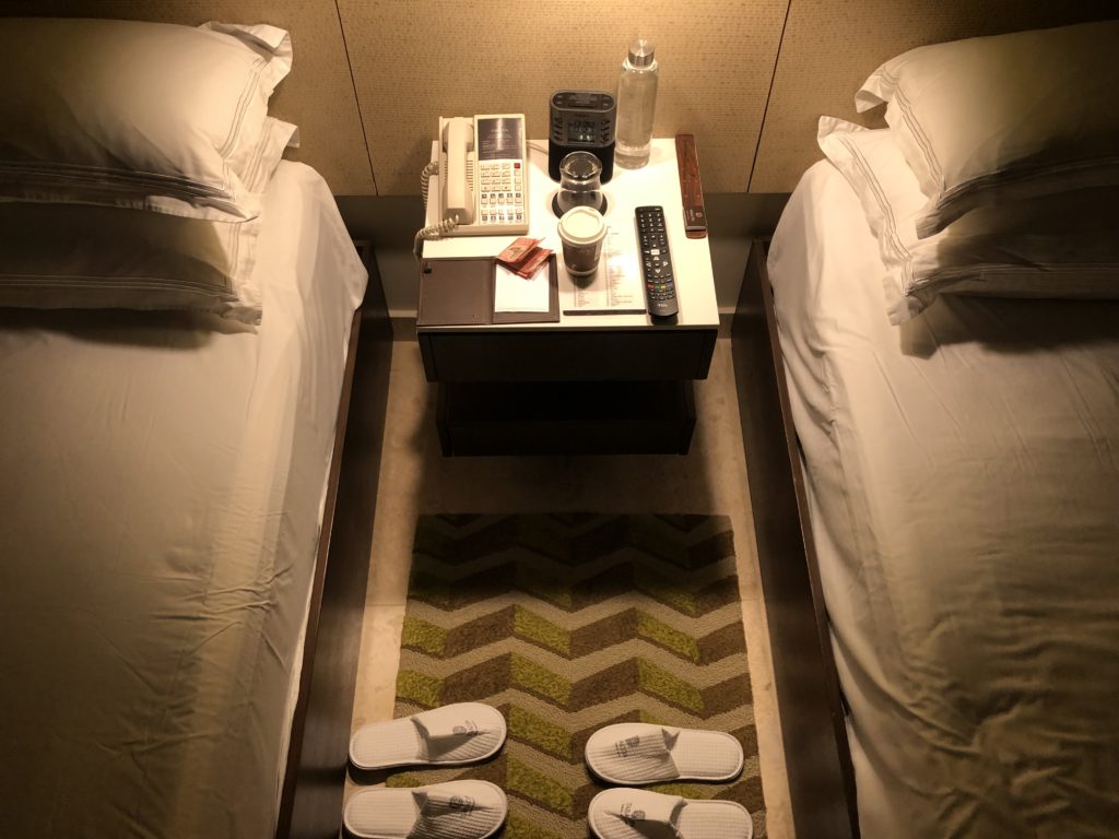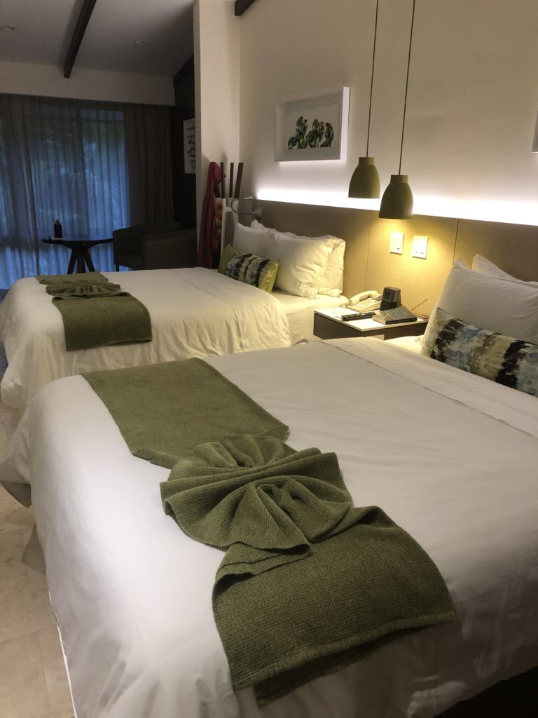 Room Layout: We booked the Orchid room which has two queen beds, a lounging area with couch, desk, and bathroom amenities. The bathroom is spacious with a big walk in shower that you could even have the window to the room open if you wanted to put on a show. The rooms were air conditioned which helped with the humidity. Outside of each room had umbrella racks which came in handy during the rainstorms. The room style was very clean and updated. The bed linens were super soft and the bed mattresses were very comfortable. I loved that the housekeeping did turn down service for our room each night, putting slippers out and towel art for us to enjoy.